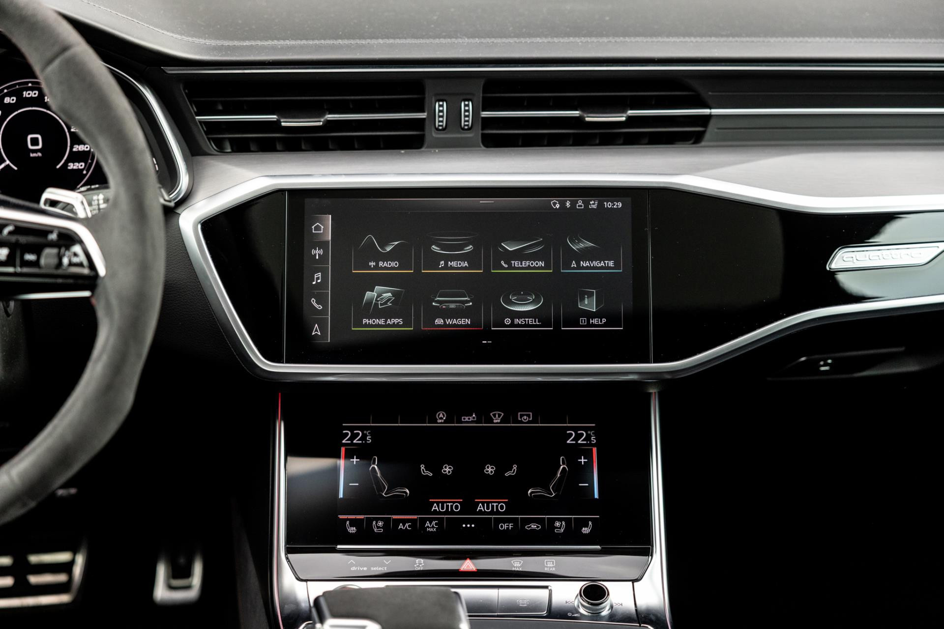 In nieuwstaat verkerende RS6 in Nardogrijs, volledig origineel en onverprutst! RS-Dynamic+ pakket, sportuitlaat, panoramadak, Carbon optiek pakket Audi Exclusive, B&O Audio, RS zetels met ventilatie, Matrix!