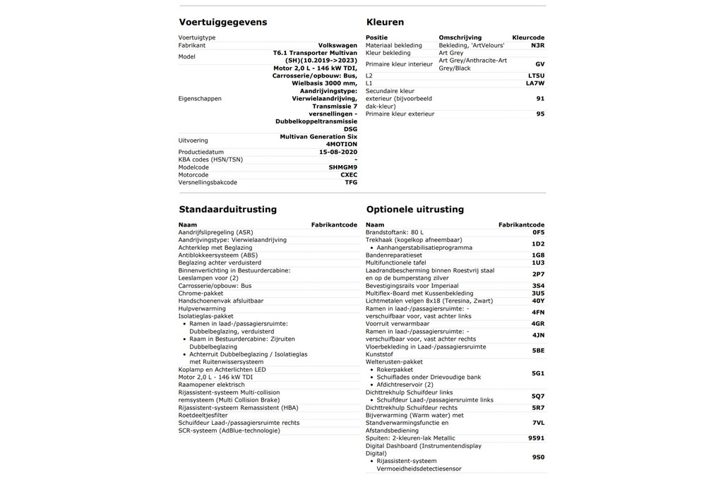 | Volkswagen Merk | Transporter Model | 2020 Bouwjaar | 5 Aantal deuren | Half leder / alcantara Bekleding | 199 PK Vermogen |